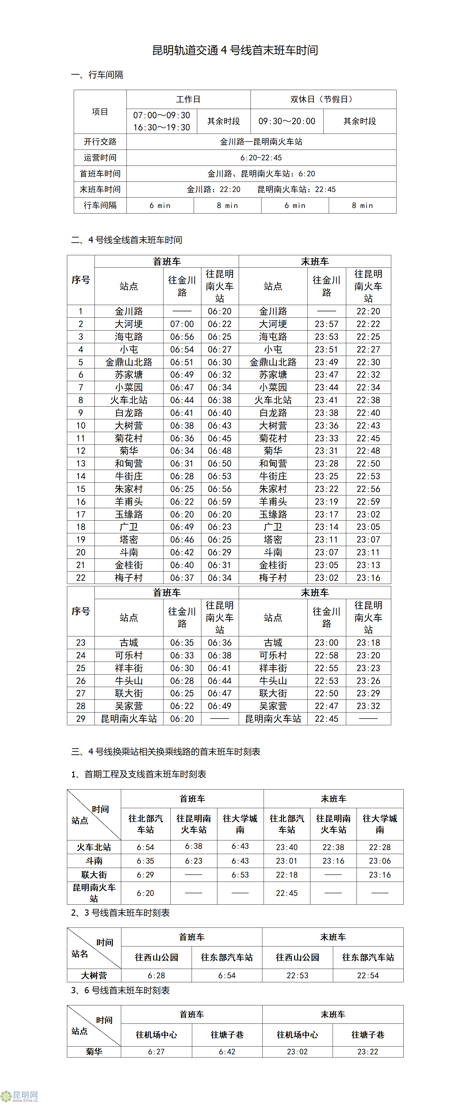 昆明軌道交通4號線首末班車時間