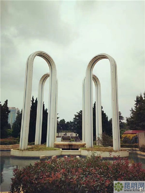 前面和兩側(cè)是一塊塊幾何圖案的花壇,主要種植月季、櫻花,形成了月季櫻花園;銅像后面由弧形的花架襯托,弧長五十米,花架后種植紫藤、葉子花。聶耳銅像正前方,建有四個(gè)弧形雕塑,與噴池、琴臺(tái)泉組成靜中有動(dòng)的景觀。