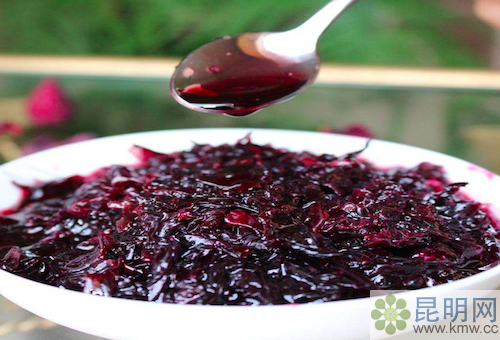 玫瑰糖是云南大理地區一種傳統食品,在這里世代居住的白族人在每年的4-5月份采摘自己房前屋后的食用玫瑰花瓣,制作成玫瑰糖,然后做成各種點心的餡料,或者添加到各種冷飲中食用。