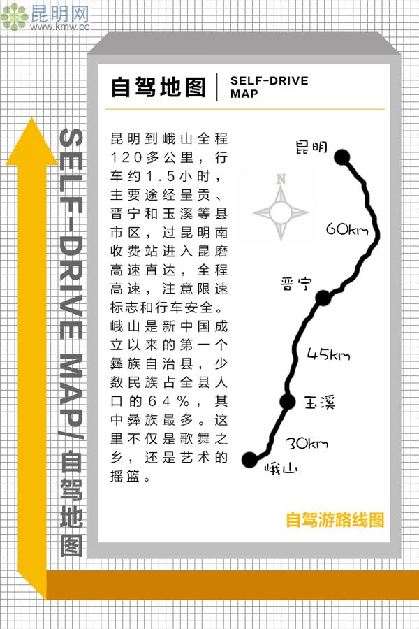 昆明到峨山全程120多公里,行車約1.5小時,主要途經(jīng)呈貢、晉寧和玉溪等縣市區(qū),過昆明南收費(fèi)站進(jìn)入昆磨高速直達(dá),全程高速,注意限速標(biāo)志和行車安全。峨山是新中國成立以來的第一個彝族自治縣,少數(shù)民族占全縣人口的64%,其中彝族最多。這里不僅是歌舞之鄉(xiāng),還是藝術(shù)的搖籃。