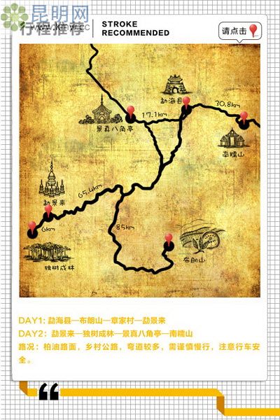 過路費共計182元,到景洪為高速路,嚴(yán)格按限速,注意車速,安全行駛。景洪到勐海為二級路,柏油路面,彎較多,需減速慢行。