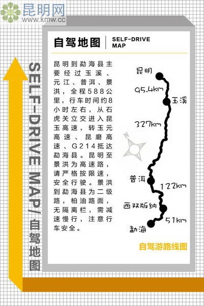 昆明到勐海縣主要經(jīng)過玉溪、元江、普洱、景洪,全程588公里,行車時間約8小時左右,從石虎關(guān)立交進入昆玉高速,轉(zhuǎn)玉元高速、昆磨高速、G214抵達勐海縣。昆明至景洪為高速路,請嚴(yán)格按限速,安全行駛。景洪到勐海縣為二級路,柏油路面,無隔離欄,需減速慢行,注意行車安全。