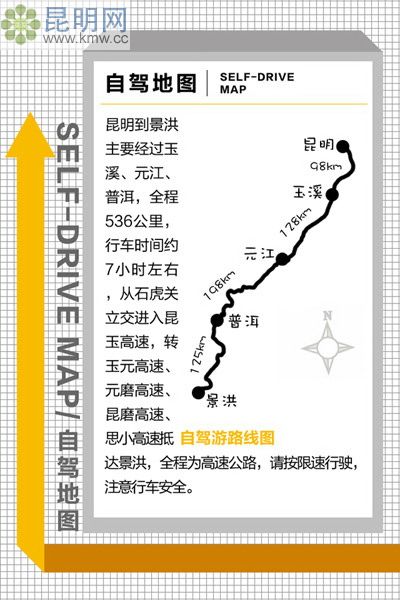 昆明到景洪主要經過玉溪、元江、普洱,全程536公里,行車時間約7小時左右,從石虎關立交進入昆玉高速,轉玉元高速、元磨高速、昆磨高速、思小高速抵達景洪,全程為高速公路,請按限速行駛,注意行車安全。