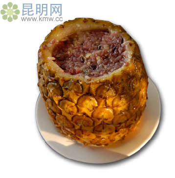 甜甜酸酸,香而不膩,是西雙版納一種獨具風味的食品,既是主食,也是菜肴。菠蘿飯的外型是一只完整的菠蘿,十分美觀大方。而殼內則是菠蘿肉與紫米飯緊密結合的柔軟飯團,米飯帶有明顯的菠蘿味,甜而不膩,吃起來非常爽口,并有補血潤肺之功效。