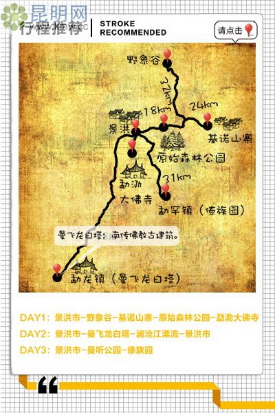 路況:市區內道路不寬,車流量多,需減速慢行;到野象谷為高速公路,請注意路邊標識;到傣族園為二級路,柏油路面,路況不錯,但無隔離欄,注意行車安全。