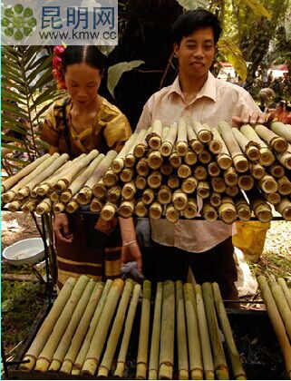 傣語稱為“考瀾”,又稱“埋考瀾”,即糯米香竹煮制。選用竹節約40[FS:Page]厘米,酒杯般粗的幼嫩糯米香竹,裝適量的糯米和水,放在火堆中烤熟,破開竹筒,飯上包裹著一層雪白的竹瓤,用手握而不會粘手,可隨意分段食用。在10小時內不會變硬返生,可熱吃亦可冷吃,米飯香軟可口,融糯米香、青竹香于一體。