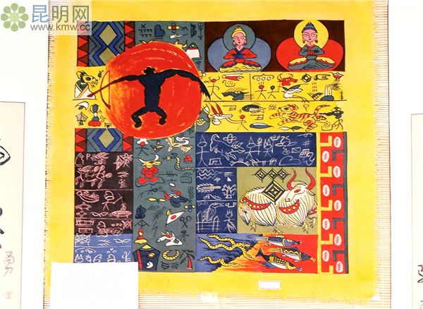 東巴掛毯采用當地優質的細羊毛,精編細織而成,圖案為黑色羊毛繪制,以納西古老的東巴字畫和富有吉祥美好寓意的圖案構成。