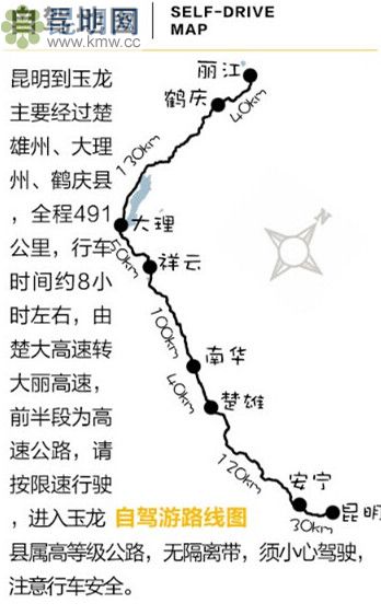 昆明到玉龍縣,約500公里,全程約8小時。途經杭瑞高速G56——南澗路G320——214國道——大麗線S221。過路費165元。