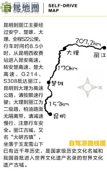昆明到麗江全程約523.2公里,行車時間在7小時33分鐘左右。入昆楚高速135.9公里后轉至楚大高速、214國道后到達麗江。