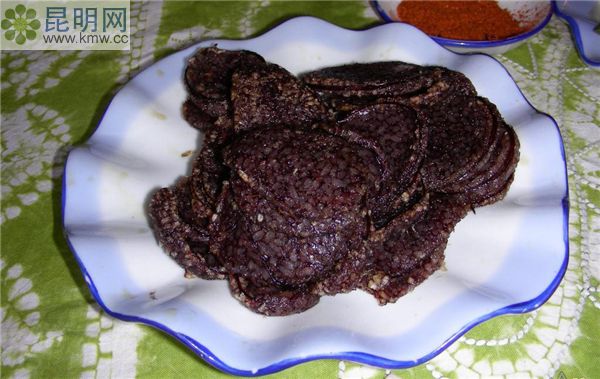 在納西語里稱作“麻補”。把大米或糯米蒸熟后,拌在新鮮豬血、蛋清及各種香料里,然后灌到洗凈的大腸內,封好蒸熟而成。麗江古城的小飯館里有這道菜。
