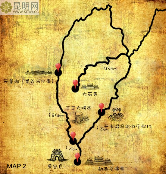 昆明到景谷主要經過玉溪、元江、墨江、寧洱,全程490公里,行車時間約7小時左右,由昆玉高速、玉元高速、元磨高速、小磨高速,寧洱出口下,進入G323二級公路至景谷,高速路段為397公里,二級路段為93公里,高速路請按限速行駛,二級路面無隔離欄,需注意行車安全。