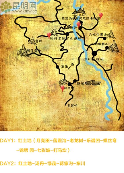 從昆明出發沿G85/G56昆曲高速至嵩明轉G85嵩待高速至小龍潭出口下,然后沿龍(潭)—東(川)—格(勒)公路至東川區,除龍東格段為普通公路外,其余為高速。需注意的是昆明出發過烏龍收費站后車流量極大,且大車很多;嵩待高速過了功山后路面為雙向二車道,中間無隔離欄,謹慎駕駛。龍潭至東川段坡大路窄彎多車密,進入河谷地段應注意地質災害。