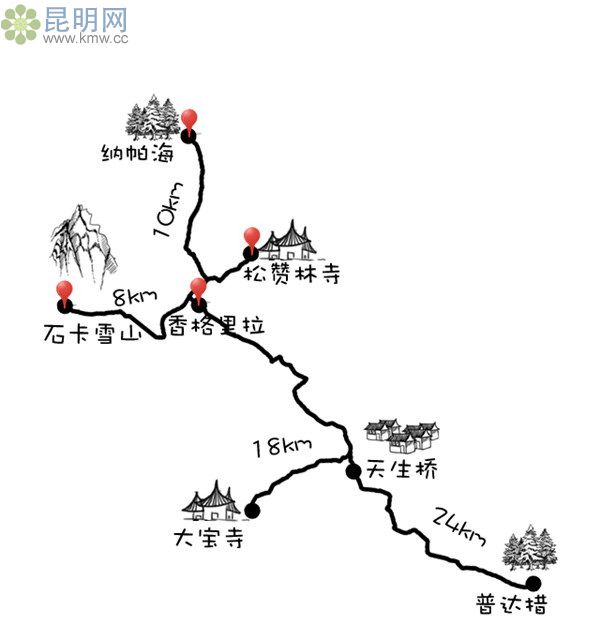 昆明至香格里拉縣距離622千米,大約耗時10小時30分。路線為昆明-楚雄-大理/麗江-香格里拉(先走昆楚高速,后上楚大高速,到大理后轉入人民北路,后上214國道到達香格里拉)。昆明到大理400千米,全程高速,注意行車安全。