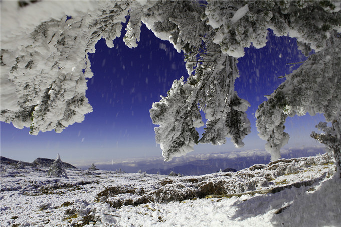 潔白的霧凇為轎子雪山披上一層白紗,在藍天白云的映襯下,轎子雪山如“冰美人”般楚楚動人。掛滿霧凇的樹枝隨風搖曳,整個轎子雪山展露新顏,如同冰雪世界。游客在轎子雪山一片白雪皚皚的仙境里,還可以挑戰北方人特有的冰雪運動,品嘗特色羊湯鍋宴,不禁令人感嘆“在春城昆明,也能看到如此美妙的北國風光。”