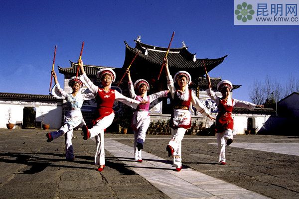 白族的霸王鞭是白族民間七十四中舞蹈里最具代表性和流行最廣的舞蹈,它不僅在“繞山林”、“鬧春節(jié)正月”、“田家樂”三種民俗中存在,而且 在建房嫁娶或喜慶佳節(jié)中,都有表演。霸王鞭舞蹈滲透著白族的歷史變遷、宗教活動、民族習(xí)俗和文化娛樂,具有古樸幽默、典雅剛健、歡快明朗,清新活波的諸多特點(diǎn),反應(yīng)了白族人民勤勞勇敢、純樸善良、團(tuán)結(jié)進(jìn)取的精神。