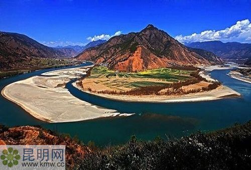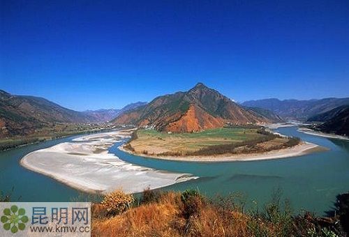 怒江流經(jīng)貢山獨(dú)龍族怒族自治縣丙中洛鄉(xiāng)的日丹寨子附近時(shí),由于千丈懸崖絕壁的阻隔,江水的流向從由北向南急轉(zhuǎn)為由東向西,但流出300余米后, 又被丹拉大山陡坡?lián)踝×巳ヂ罚?只好再次掉頭由西向東急轉(zhuǎn),因而在這里形成了一個(gè)巨大的半圓形的大灣,當(dāng)?shù)乩褰兴?ldquo;火夾”,后通稱(chēng)為“怒江第一灣”。這里的江面海拔約1700米,氣 勢(shì)磅睛,風(fēng)光搞施。