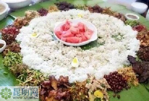 “手抓飯”,是富有傈僳族地方風(fēng)味特色的小吃。其選料的方法是:以本地特產(chǎn)香米煮熟后倒在洗滌干凈的簸箕內(nèi),在米飯上面放切成小塊的黃燜小豬肉、火燒雞肉、熟火腿、油煎土豆、涼拌魚(yú)腥草、清煮南瓜及特色佐料,然后盛一碗鮮雞湯放在每一位客人面前。
