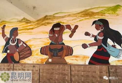 壁畫內容豐富,畫上有古時佤族先民的生活、祭祀、村寨等圖案,還有現代佤族人民的耕種、戀愛、制作木鼓等,畫面生動,色彩艷麗。