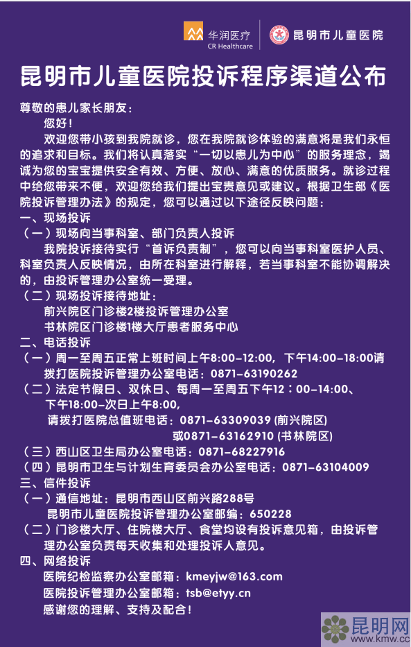為切實落實以病人為中心的服務理念,醫院通過取消掛號環節和增設收費點的方式節省患者就診時間;通過采用支付寶和微信平臺、移動查房、床旁結賬等措施,使更多的患者享受到“互聯網+醫療”模式的便捷;通過獨立設置投訴辦公室,能夠更加及時地解決患者的投訴,從而緩解或消除患者的不滿情緒;認真落實以“患者為中心的優質護理服務”活動,認真落實責任制護理,實施醫護共管患者工作模式;推行日間手術;實施急慢分治;提高應急能力,暢通綠色通道,有效救治危重患兒;與昆明市轄區內縣區醫院積極聯系,與富民縣人民醫院合作,全面托管兒科綜合管理,成效明顯;主動承擔各種突發公共衛生事件的應急處置,在歷年成功應對麻疹爆發、三聚氰胺奶粉事件、汶川地震震后孤兒健康體檢和心理輔導、危重手足口病救治等公共衛生事件的處置中,獲得省市各級行政部門和社會的認可與好評;醫院是目前醫院里成立西南地區******的獨立社工部的醫院,旨在為生命有限的孩子及其父母、家屬給予專業社工的幫助分擔了醫患壓力,改善緊張的醫患關系;醫院創新性地采用院長查房和職能部門現場辦公的方法解決科室問題。