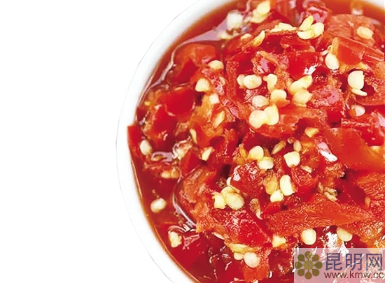有一種辣醬,湖南人叫剁椒,云南人叫糟辣子,可直接吃或用于拌菜、炒菜或調蘸料。糟辣椒色澤鮮紅,香濃辣鮮,既辣又酸。記憶中,只要小小的一碗糟辣椒醬,便可以吃很多的米飯。糟辣椒的做法相對簡單,將紅彤彤的辣椒、姜、蒜洗干凈剁碎加入調味料,再將剁好的辣椒等放入用于腌制的壇內,壇沿放一圈水與空氣隔絕,待一周左右糟辣椒醬便腌制好了。